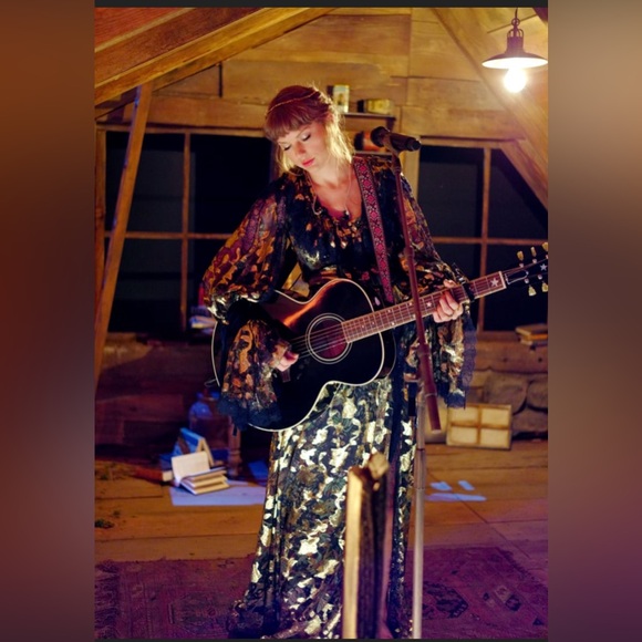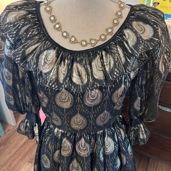 This is a handmade vintage dress has amazing puff sleeves, and a ruffled collar. Size medium. Black and gold. Lined. Has a healthy zipper. Waist: 14.5” (no stretch) or 29” waist Pit to Pit: 19” (fabric has darts at the bust that could possibly allow for another 1/4 inch) 38” bust #swifty #erastour #taylorswift