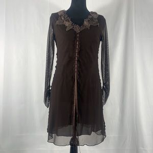 Pretty Angel Brown Dress,tunic dress, top,lace,floral design, sheer, ruffleslong sleeve,small