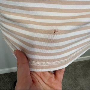 The popular and much loved Power Y Tank Top By Lululemon in the colourway ‘Narrow Bold Stripe White Naked / White’ Luon Fabric Skinny Y Racerback Built in shelf bra (has pockets to add cups but doesn’t include the cups) Fitted silhouette This is in really good overall condition. There is a very faint mark at the neckline and a very small hole by the bottom front hem from catching the fabric. Not noticeable while wearing, please see pictures.