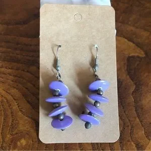 Purple beaded disc dangle earrings, lightweight, fish hooks, come on card with silicone backs as shown, minor age/wear, 2” long.
