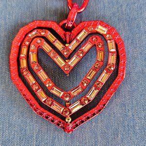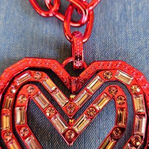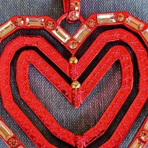 This is a Beautiful and Super-Fun Valentine-style / for Every-Day Wear, 3-D STATEMENT NECKLACE by Betsey Johnson, from her "Look Into Your Heart" Collection. The iconic "BJ" Gold-tone Heart is present. Lobster Clasp for Closure. Gold-tone and metallic red-tone hardware. Beautiful Red and Clear Stones.