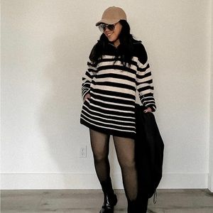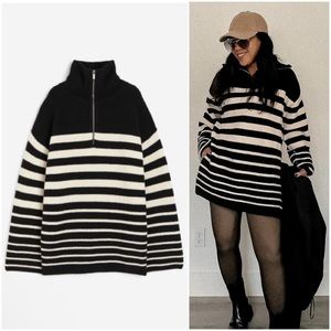 Black/Cream Striped Rib Knit Half Zip Sweater