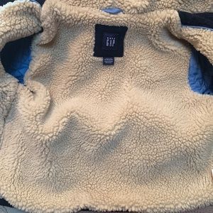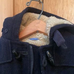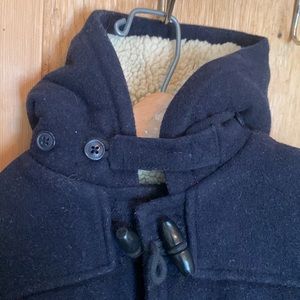 This coat has all the sweet little extras for your little winter outdoor adventurer including a neck strap to keep hood up, and a secret interior zipping pocket. Has zip and toggle button closure. Soft Sherpa interior lining and super warm wool shell exterior. Very dark blue. Excellent pre-loved condition.