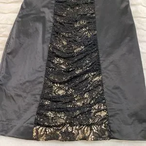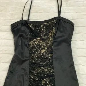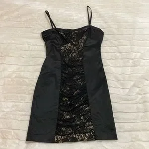 Bebe dress from the 90s era. This dress is classic, chic and beautiful. No flaws. Great quality that has lasted. Size small. Adjustable straps. Lace from. Zipper in the back. No stretch thick material. Retro.