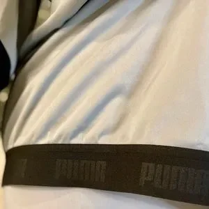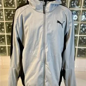 Never used just washed once size large Puma windbreaker jacket. Mesh lining and a hole with a loop to run headphones through the jacket from the side pocket. Lightweight gray and black with hoodie. Smoke free home
