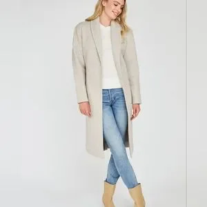 Tie belt wrap coat with a wool feel in heather oat color by Canadian brand Gentle Fawn. Has two snaps that can fasten the front. Brand new with tags, never worn. Sold out in this size on their website. Has pockets!