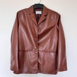 This is a single-breasted blazer with a notched lapel and inseam pockets. It’s made with our innovative Vegan Leather that looks and feels like the real thing. Features Single button closure Fully lined Shoulder pads Topstitch detailing throughout Materials & Care Content: 100% polyurethane; Interior: 100% polyester; Lining: 54% polyester, 46% viscose Care: Dry clean Imported
