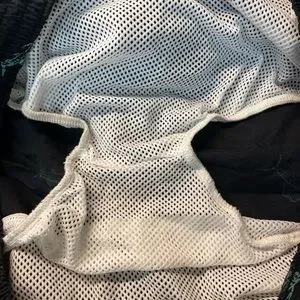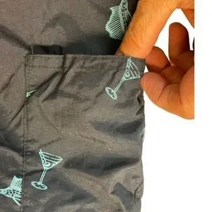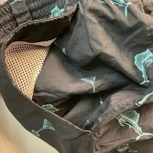 Black swim shorts with mesh liner. Marlin and martini print in turquoise. Very good condition. BoxZB
