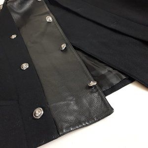 A vintage jacket in a black shade. It has an officer collar and padded shoulders for a structured silhouette. Made from cozy wool and has a unique combination of materials, including a faux leather panel, corduroy sleeves, and decorative silver buttons. It has buttoned cuffs and front welted pockets for added style. Great condition.