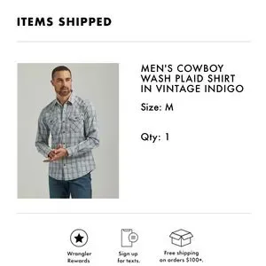 This is a gorgeous button-up shirt from Wrangler. It’s the cowboy wash so it has a vintage look to it, even though it’s brand new with tags. I ordered the wrong size and missed the return window.