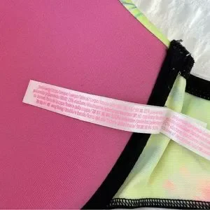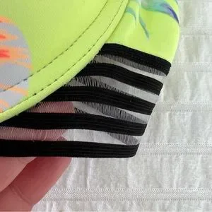 Wear Everywhere push up bra from PINK Victoria's Secret. Adjustable straps. Pretty bright lemon yellow with blue, purple, pink and orange floral and leaf print. Black band with shadow stripes and straps. Super strappy back. Front closure. Heavy push up padding. In great used condition, only flaws are some gaps in the clear stripes, see photos. Size 36DD.
