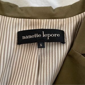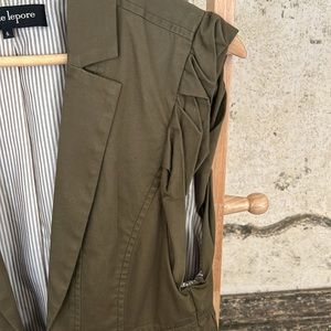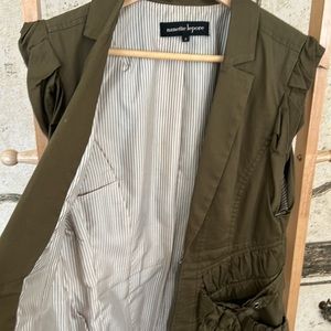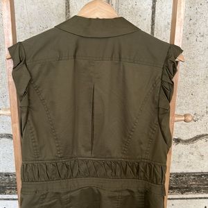 Nanette Lepore darling army green vest. Front double zip with slight ruffle detail at shoulders & great detailing on front pockets & waist w adjustable tabs. Can be worn over a shirt, under a jacket or on its own. Great classic piece with a cool edge!
