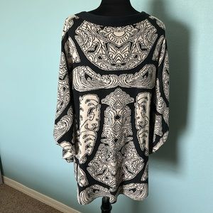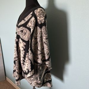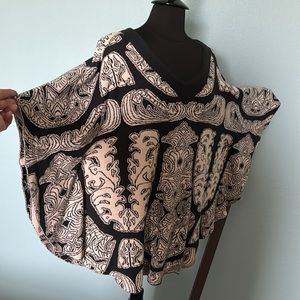 Black/white print poncho with 3/4 sleeves. V neck, 24 inches in height.