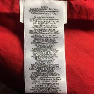 A longline faux leather jacket with contrast red pop of color and side buckle details makes any outfit biker chic.