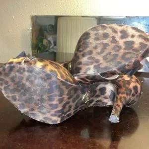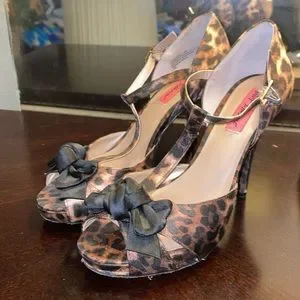 Betsey Johnson "Canddee" heels. Leopard print t strap with adjustable buckle. Black bow accent. Size 7.5