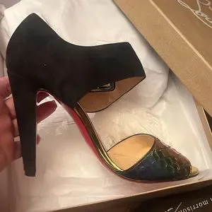 Christian Louboutin Paris heel shoes. Made in Italy size :38 . Multi color. Heel :4,5” . Sued and snake . Beautiful heels shoes . All questions welcome. Once worn. ( see pictures)
