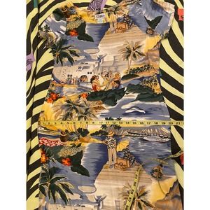 Vintage shift dress, Aloha shirt style. 100% spun rayon, these dresses are so soft and flattering. This print has (white) tourists disembarking from seaplanes, along with depictions of presumably native Hawaiians. Does that make it inherently less appropriative, because it acknowledges the nature of Hawaii's tourism industry? Or more/worse? Does it depend who wears it? Food for thought!