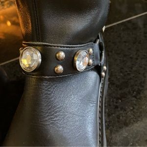 A rhinestone and stud embellished harness brings a moto-inspired edge to this boot secured with a soft stretch shaft for easy-on comfort.