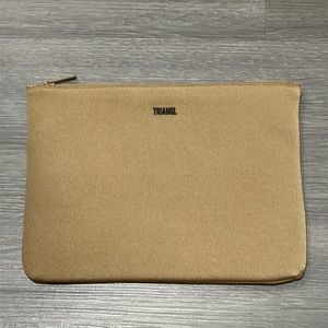 Hot pink thread swimsuit set with high waist bottoms and tan/gold shiny bonus bag.
