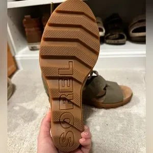 Worn once, great condition! Super comfortable wedge from Sorel. It’s an olive green color. Can look grayish depending on the color you are wearing them with.