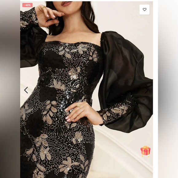 This dress is a beautiful black and gold long sequin gown with puff sleeves and cuff sequin details matching the gown