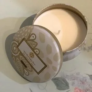 Huntington Home 3.5oz Hot Buttered Rum scented Soy Coconut wax candle in a decorative tin.