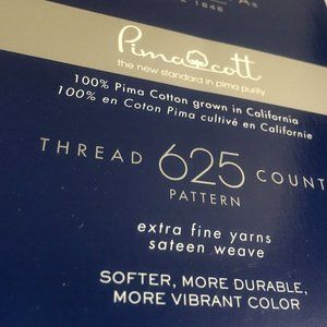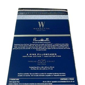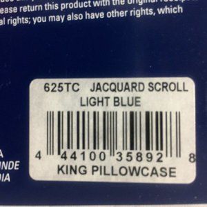 brand new pair of Wamsutta 625 Thread Count 100% Pimacott Cotton King Pillowcases. Package states: "the manufacturer's name for the color / pattern is Light Blue / Jacquard Scroll. Finished Fabric: 20 inches x 38 inches ... fits pillows 20 inches x 36 inches. Machine washable." Condition is brand new in unopened, undamaged, original retail packaging ... UPC 444100358928.