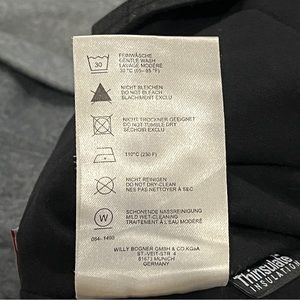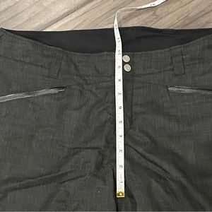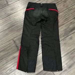 Very cool ski pants in charcoal gray with red accents. In certain light, the rear looks a little dingy/faded as shown in last picture. Zippered bottom leg slits.