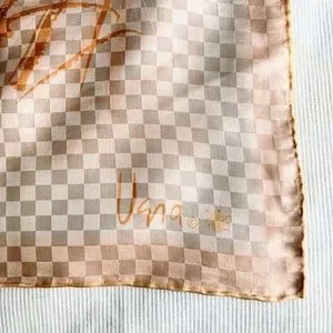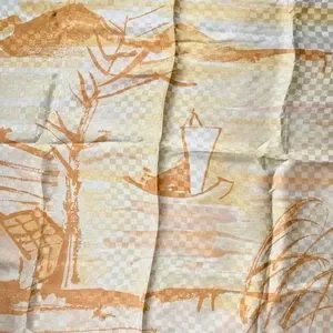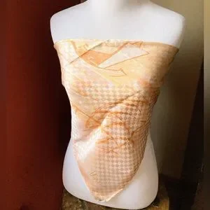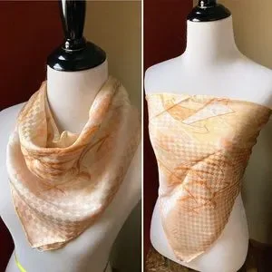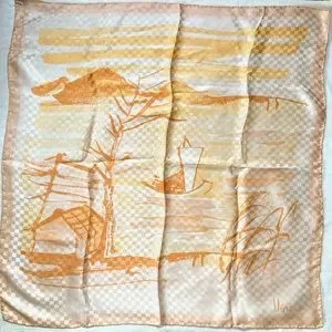 Vintage Vera Neumann Silk Japanese Asian Boat Landscape Scene Cream Orange Square Handrolled Scarf. Beautiful artwork style design. Mountain, house and boat landscape. Vera with the ladybug signature. Made in Japan, 100% silk. Measures approximately 25”x25”. Does have one small spot in the upper left hand side corner, see last photo.