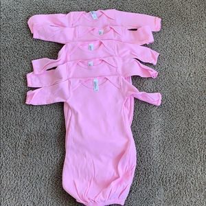 Brand new without tags American Apparel Size 0-6 months Light pink Infant Baby Rib Long Sleeve Gown Peek-a-paw sleeves help prevent self-scratching on a cozy sleep gown made from gentle cotton Fold-over mitts prevent self-scratching Lap shoulders and elastic hem make changes easy Cotton feels soft against baby's skin Length: 19.5” Sleeves: 6.5”