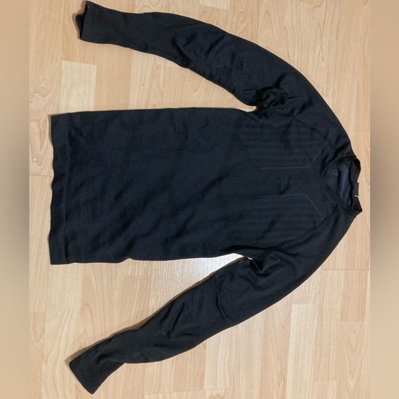 White long-sleve thermical shirt for sport. It has thumbholes. The fabric is not too thick but it’s very warm. The fabric is also stretchy so it is comfortable, and breathable so it is good for sport. The shirt is good for temperatures up to -10 degrees (more or less). It is a US women size S. It is from Decathlon.