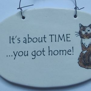 Vintage August Ceramic Cat Wall Plaque Sign Hanging Off White Beige USA Brown