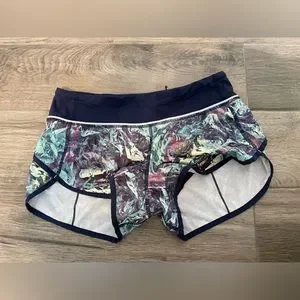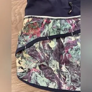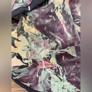 Lululemon multi color shorts with purple and green crumple pattern. The stitching is in tact but missing the tag.