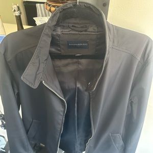 Lightweight jacket perfect for spring or summer. Easy to dress up or down. Banana Republic, medium, 100% polyester, black. Two front pockets (zippered) and zipper closure. Two Button collar makes this jacket easy to transition from day to night. In excellent condition. Lightly worn. Made in India.