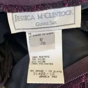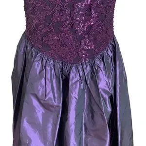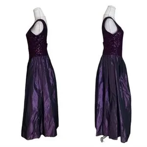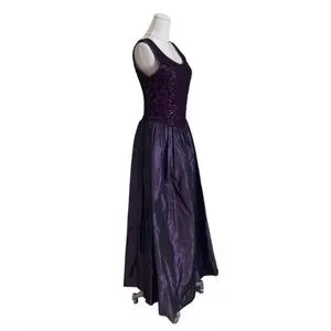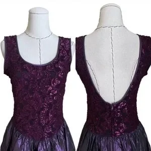 vintage 90s jessica mcclintock gunne sax sleeveless purple lace top with full taffeta skirt formal gown. perfect for any prom, formal, party, costume. lace top portion has stretch. low back with zipper closure. plush layer of black crinoline underneath. marked a size 9/10, this can work for a size small to medium. for reference, mannequin is a size 4 and it's a little big on it. excellent pre-worn condition.