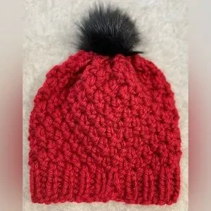 This knit hat was made with red acrylic yarn and has a black faux fur pompom. It’s adult size and very stretchy. This one of a kind knit accessory was made by me! It’s a very warm hat and would make a thoughtful gift.