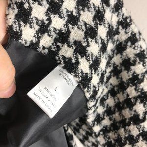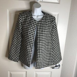 Black and ivory hounds tooth collarless cape with open front. Fully lined.