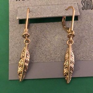 Gold tone lever back drop earrings feature a gold tone textured metal feather drop. Earrings approximately 1.6” inches long. Made in China