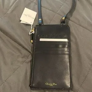Never worn tags still attached Dior zip plus pocket and card holder. Dior design and leather combination. Gold hardware adjustable. Stunning piece. Approx 8x4.5 Strap approx 21 inches long but can be made shorter. Straps can be removed and use wallet alone. No price adjustments.No dust bag