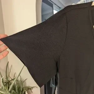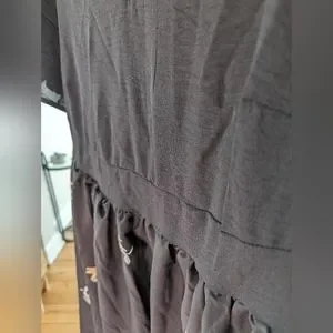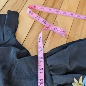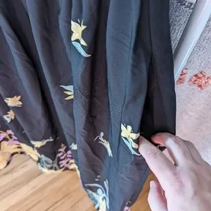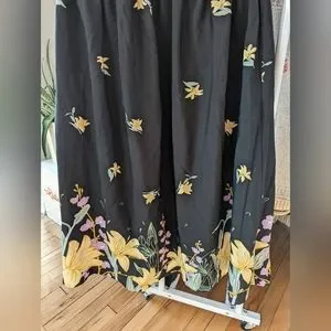 texture crepe fabric on bodice and sold floral skirt. thick waist band for definition.