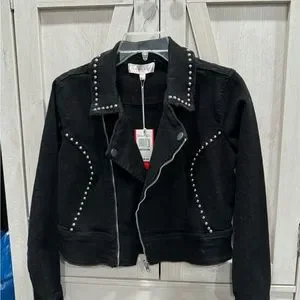 This is Super cute. New with tags. It’s a heavier denim with a raw edge and stud detail. It’s so trendy and will go with everything!