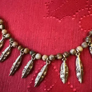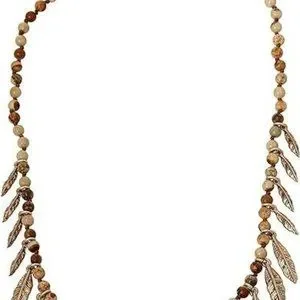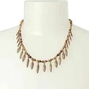 Semi-precious jasper stone beaded strand necklace with shaky textured leaf motif charms at front.