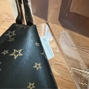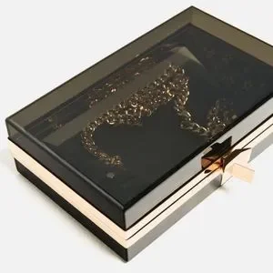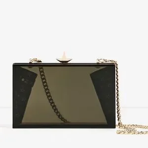 Black minaudiere. Transparent material. Gold-toned hardware. Chain shoulder strap (can be tucked into bag to just be used as a clutch). Metallic star-shaped closure.