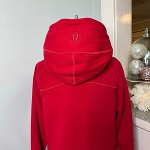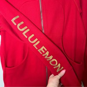 Lululemon Lunar New Year Dark Red Scuba Hoodie Jacket. Cotton fleece, version III. Dark red with gold reflective logo on the sleeve. Stretchy side panels and a cowl neck with hood. Thicker and warmer than most newer ones. New with tags. Size 12. Price is firm.