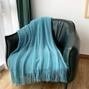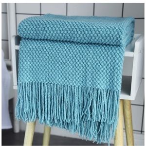 Light Sky Blue Textured Minimal Cozy Knit Pattern Fringe Tassel Couch Blanket