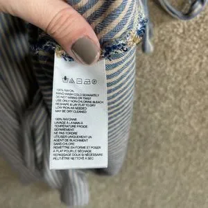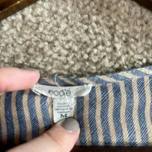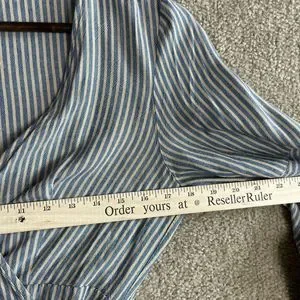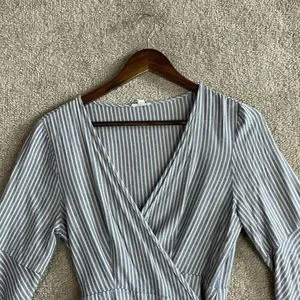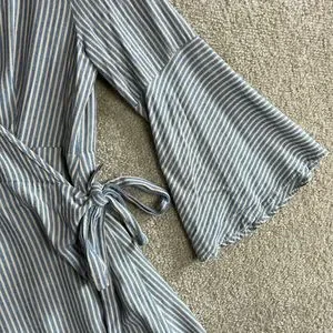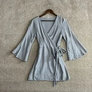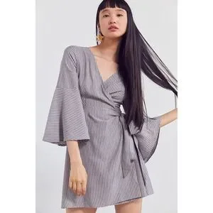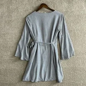 Ecote OU Wrap Dress Womens Size Medium Blue/Tan Striped Bell Sleeve V-Neck 90s