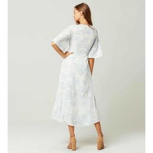 • Style Profile: faux wrap dress, cutout midriff with center front tie, three quarter length sleeves, side zipper