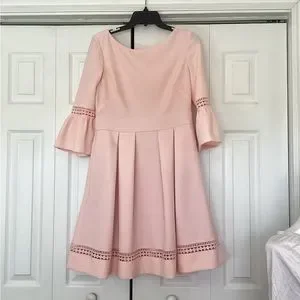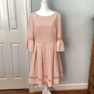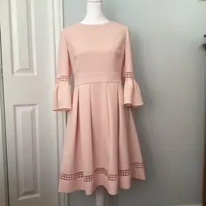 Beautiful well made classic. Flattering fit with flared bottom and bell sleeves. Lined. Open weave detail accents on hem and sleeves. Faint, lightly stain on waist. See pics for details.