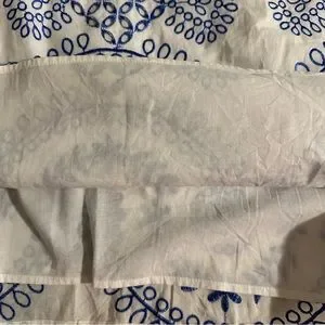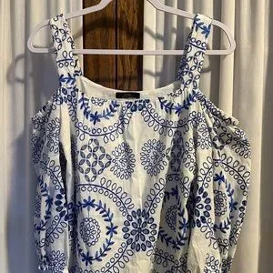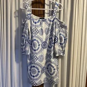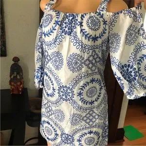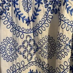 Super cute white with blue embroidered eyelet dress. Tank straps. Off the shoulder sleeves with elastic cuffs. Rounded neckline. Fully lined. 100% cotton. Machine wash. Excellent condition. Pet and smoke free home.