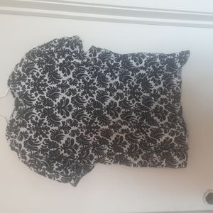 short sleeves have a decorative buckle detail, black and white pattern, cotton blend, button down has a plunging neck before buttons begin, good pre-owned condition with no holes or stains, size 2X measurements are roughly 27" from shoulder to hem and about 23" pit to pit, pet friendly non smoking home